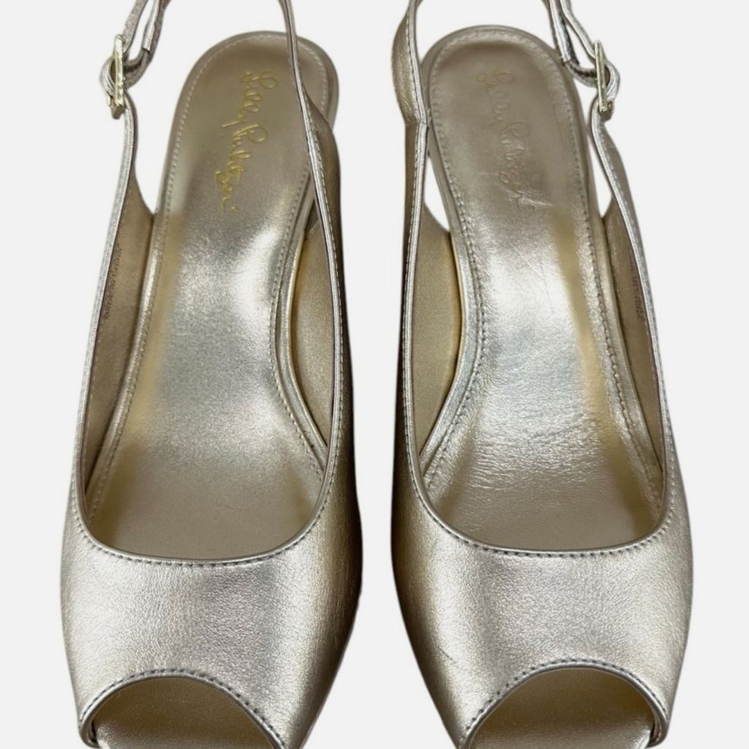 Step out in style with these Lilly Pulitzer Gigi Gold Metallic Wedges Sandals, size 7.5 These chic slingback shoes feature a dazzling metallic gold finish and a comfortable wedge heel, perfect for adding a touch of elegance to any outfit. The woven espadrille-style wedge adds a classic touch. Ideal for spring, summer, and resort wear. Excellent pre-conditioned. The Lilly Pulitzer Gigi Women's Gold Metallic Wedges Sandals are stylish and versatile slingback shoes suitable for various occasions. Featuring a high heel height of 3-3.9 inches, these sandals have a comfortable cushioned design with a lightweight and breathable construction, making them ideal for summer, fall, and spring wear. The gold metallic color adds a touch of glamour to your outfit, while the adjustable ankle strap ensures a secure fit. Whether you're traveling, attending a party, or simply dressing up for a formal or business event, these Lilly Pulitzer Gigi sandals are a chic and fashionable choice.